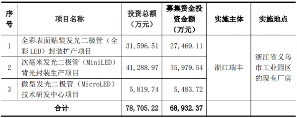5月19日,瑞丰光电新增股票正式上市,本次发行股票计划募资6.99亿元,扣除发行费用(不含增值税)后,实际募资6.89亿元,募集资金拟投向三大项目建设,项目实施主体为全资子公司浙江瑞丰光电有限公司(以下简称“浙江瑞丰”)。
